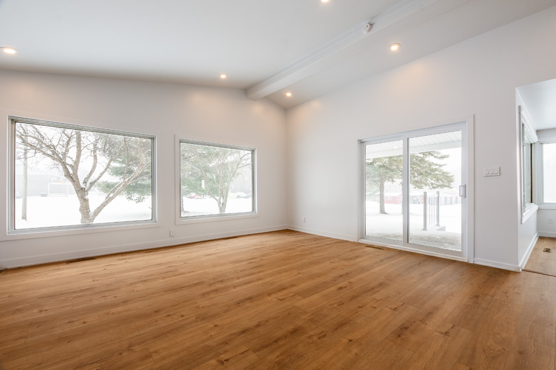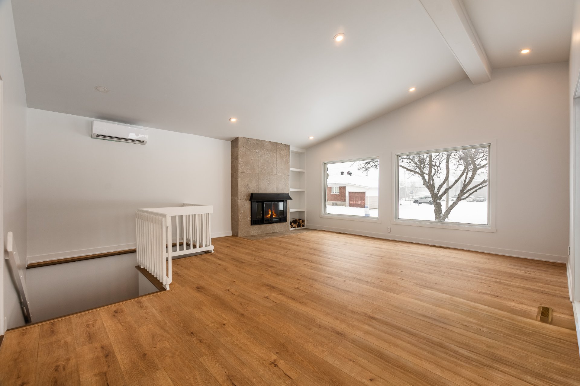 living room stands out with its cathedral ceiling and