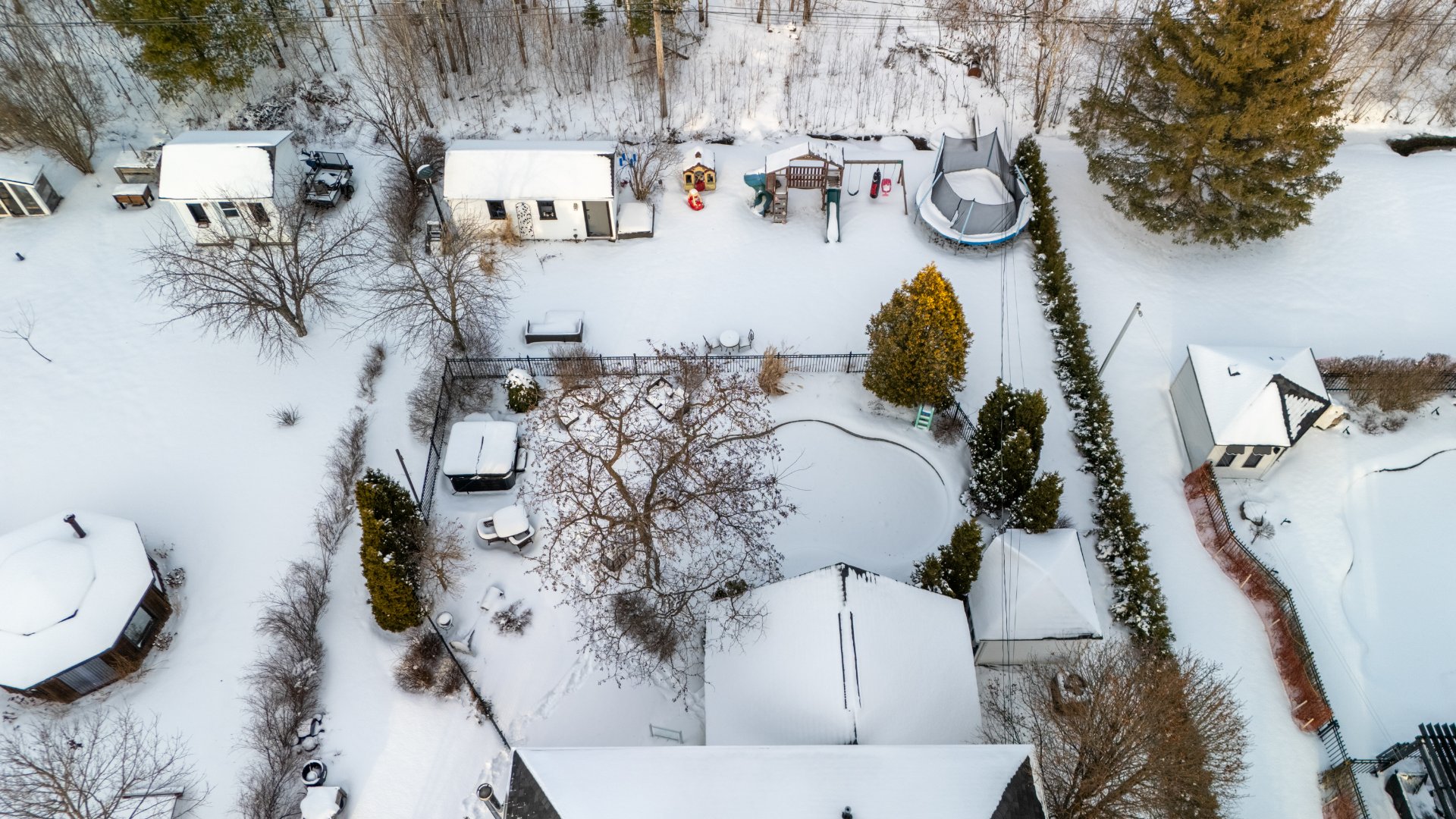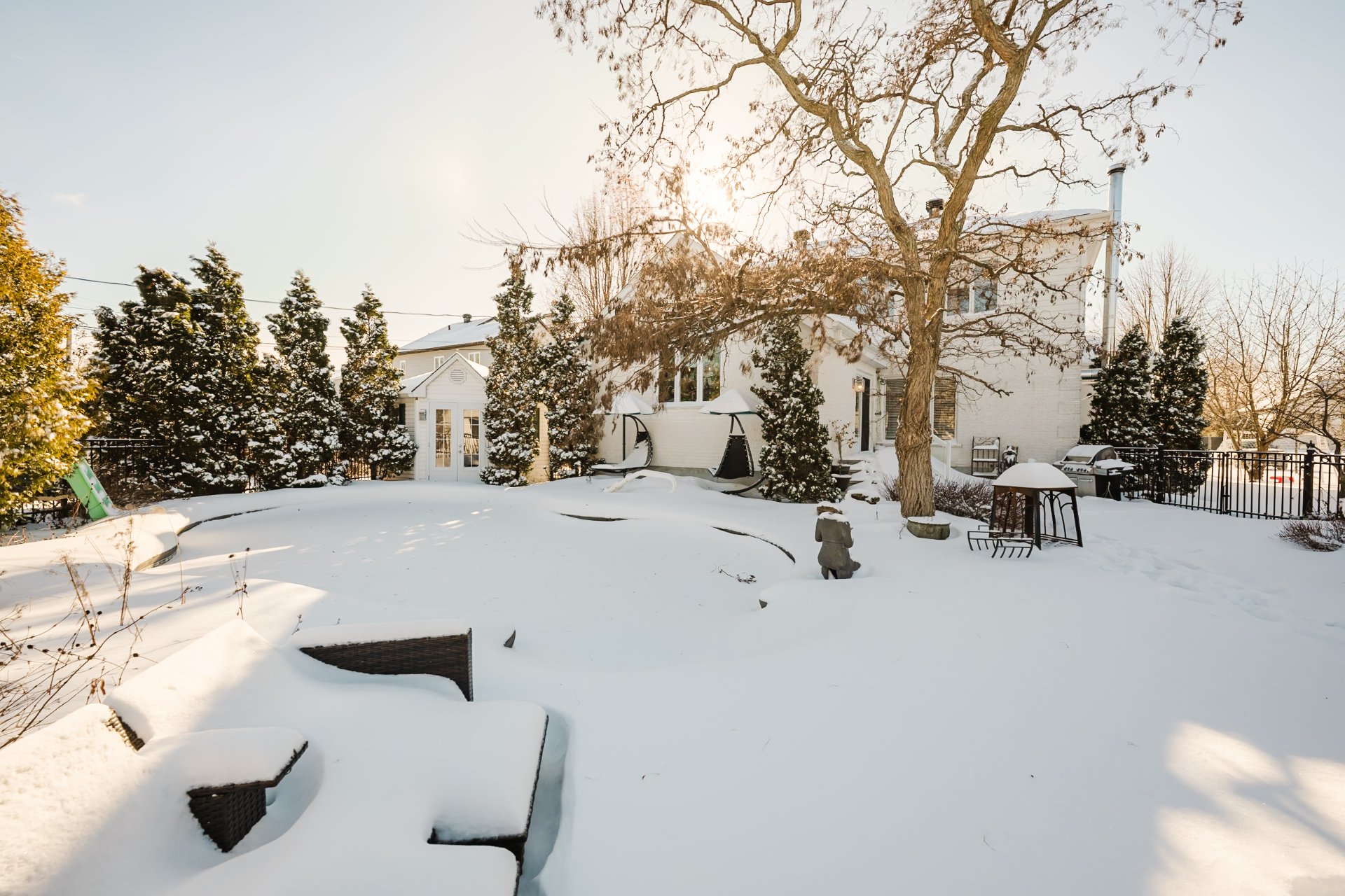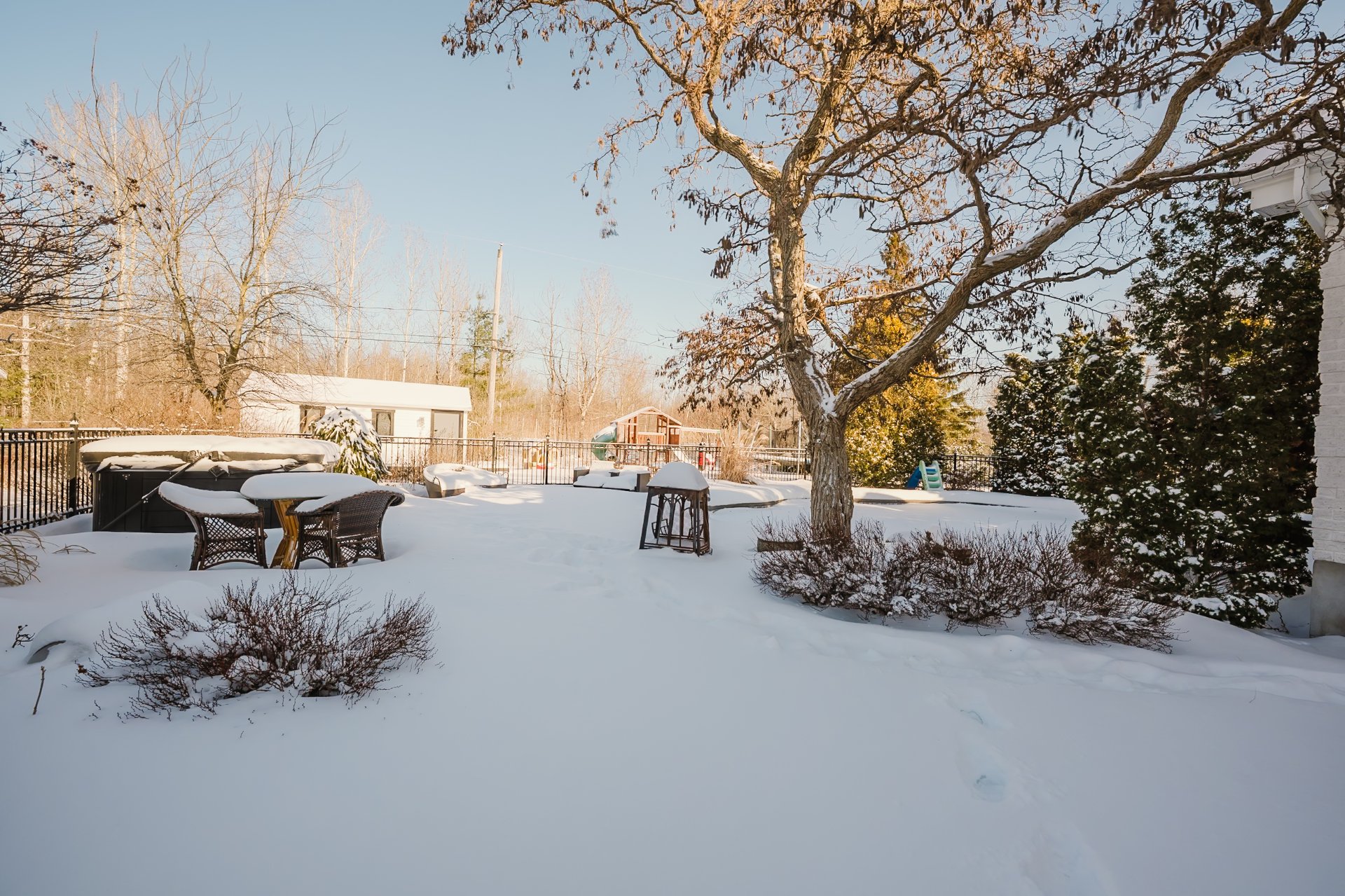 Inclus : Plaque cuisson, réfrigérateur, réchaud, lave-vaisselle, micro-ondes, 2 fours encastrés, refroidisseur à vin, 4 tabourets, 2 chaises, table en coin, 5 supports muraux à TV, aspirateur central et accessoires, 2 cabanons, luminaires permanents, pôles, stores, rideaux, bibliothèque murale, moteur porte garage, poêle à bois, filtreur chauffe-eau cellule au sel de piscine, purificateur d'eau UV, support à pneus, domotique: caméras ADT, système alarme, sonnette intelligente.