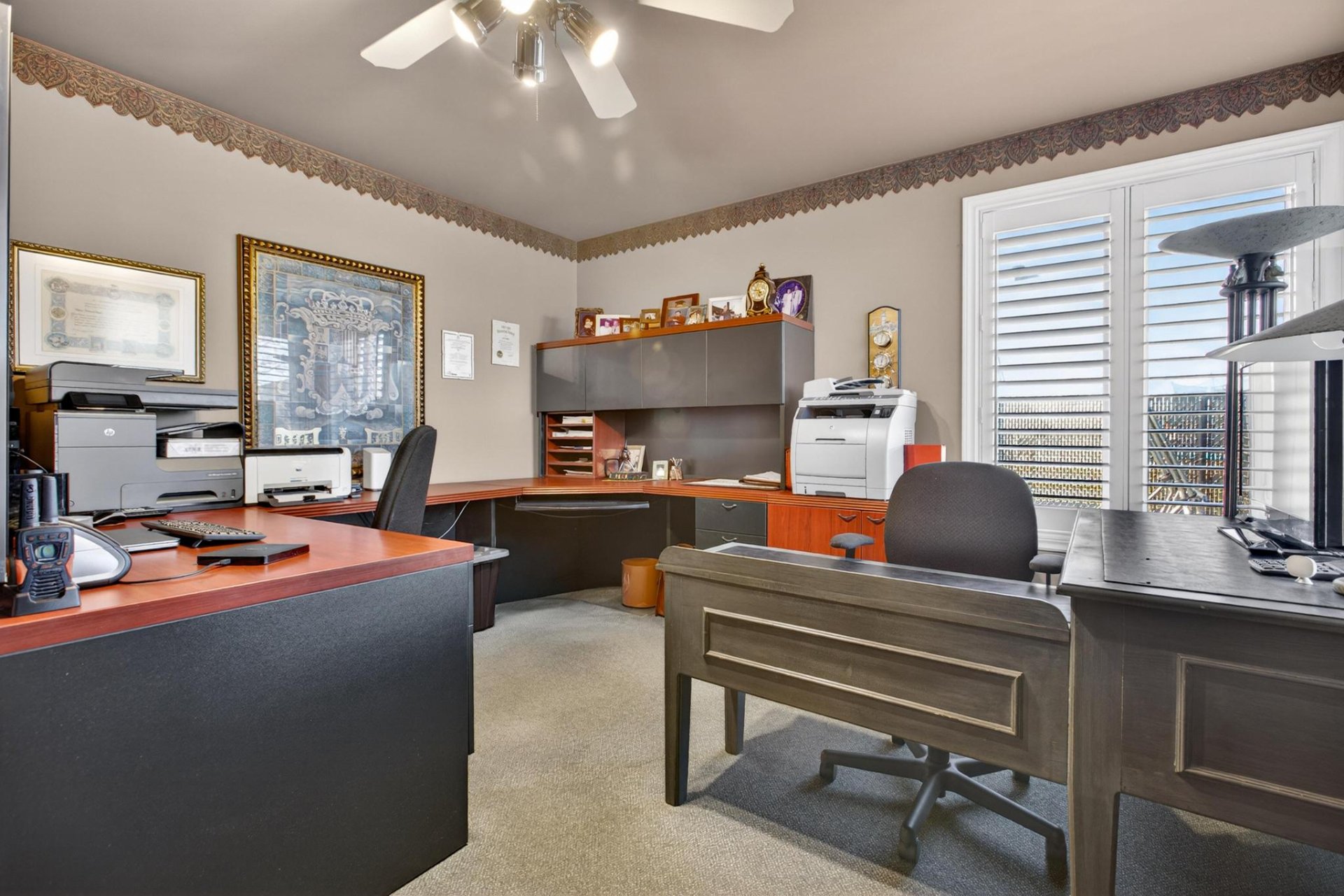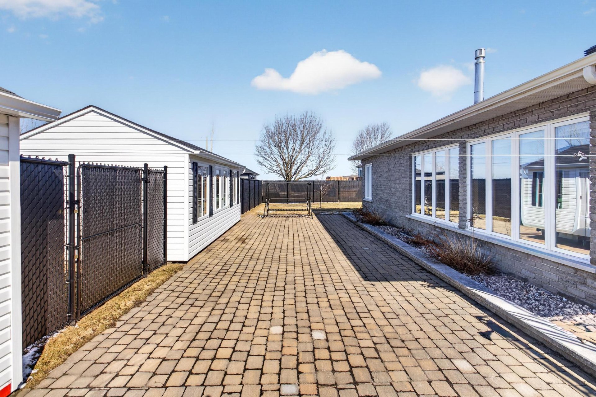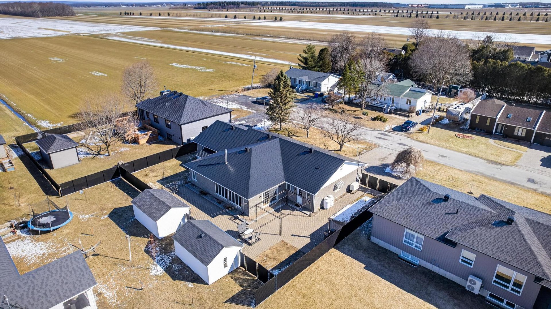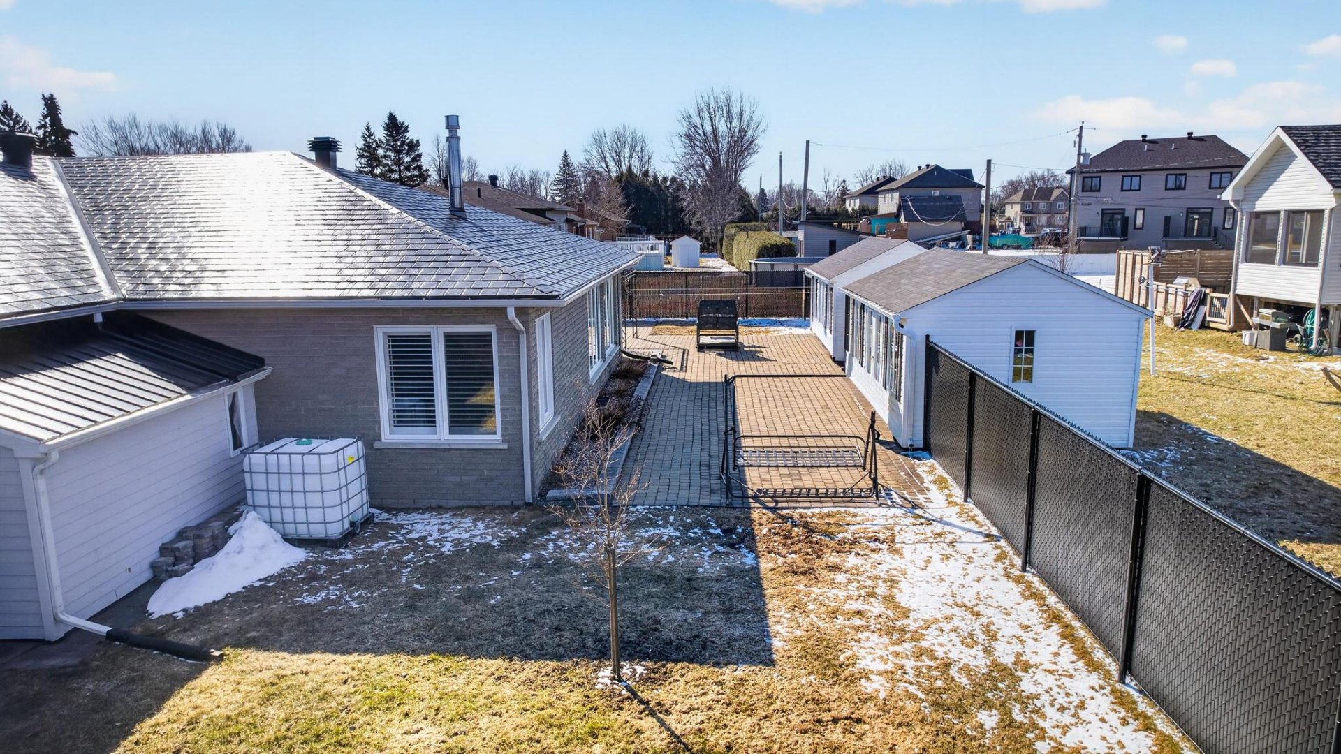 Profitez d'une cour privée clôturée avec 2 remises, grand garage et 6 stationnements.