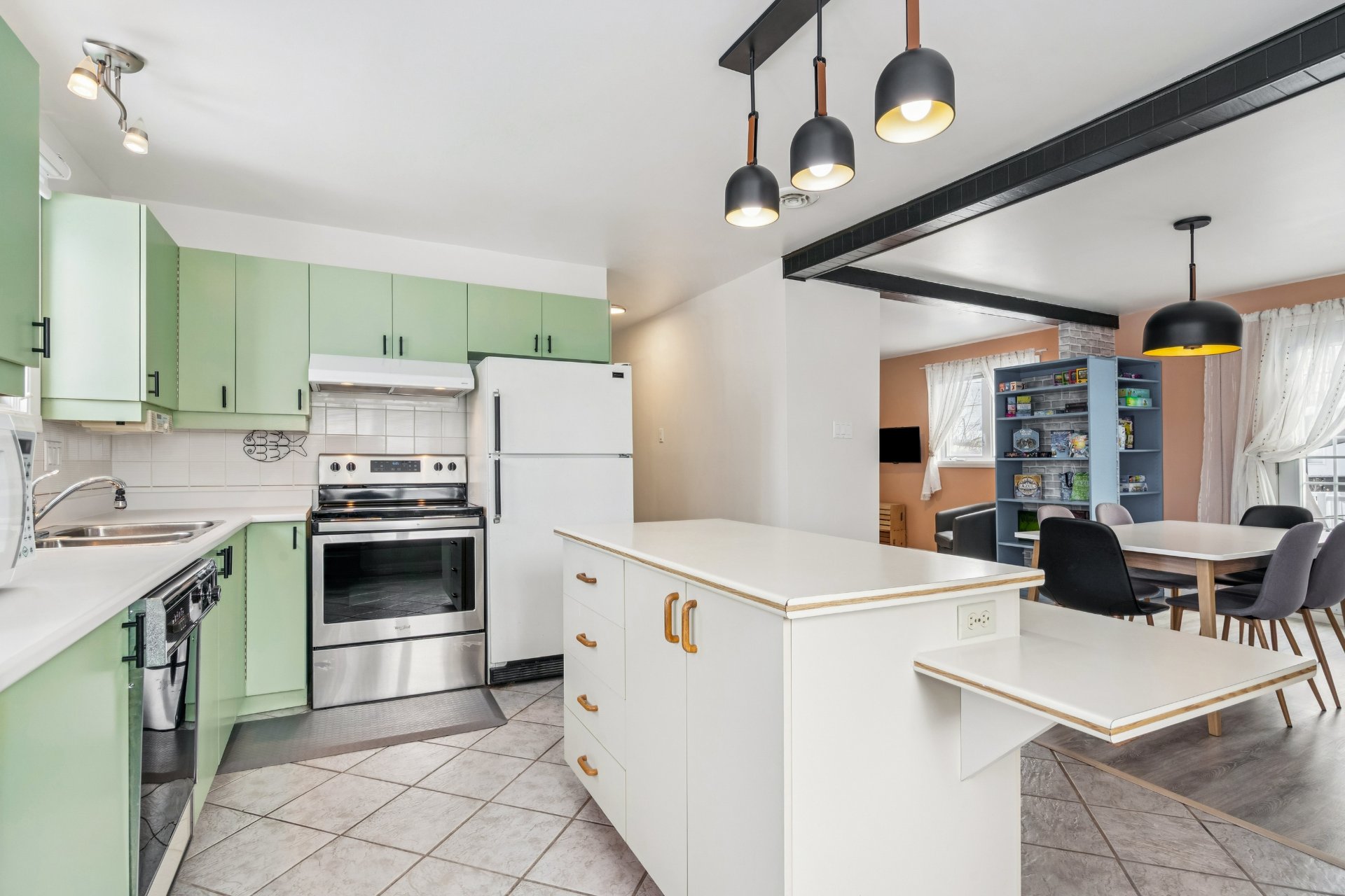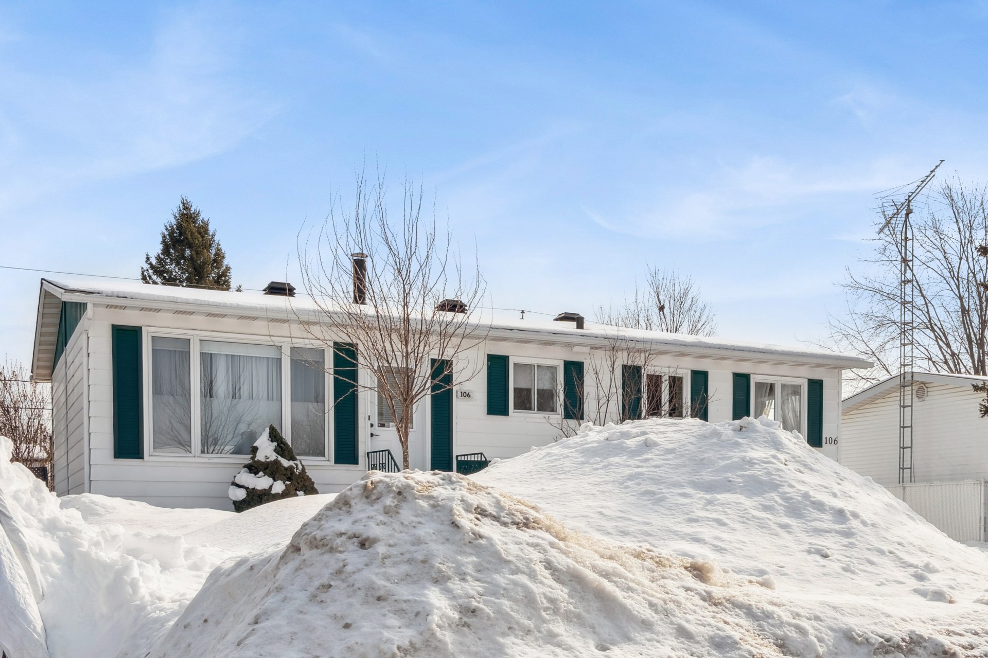 Inclus : Luminaires fixes, stores, pôles, hotte de poêle, lave-vaisselle, réfrigérateur de la cuisine, congélateur du sous-sol, aspirateur central et accessoires, support mural pour téléviseur, meuble bleu du salon, ouvre-porte de garage électrique, thermopompe, 2 coffres à outils dans le garage, classeur dans le garage, compresseur du garage, 2 unités de chauffage du garage, balançoire, hamac.